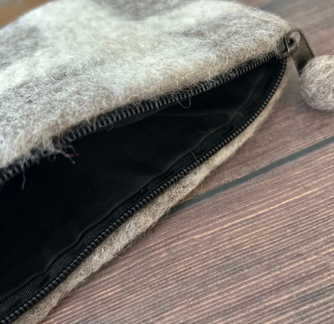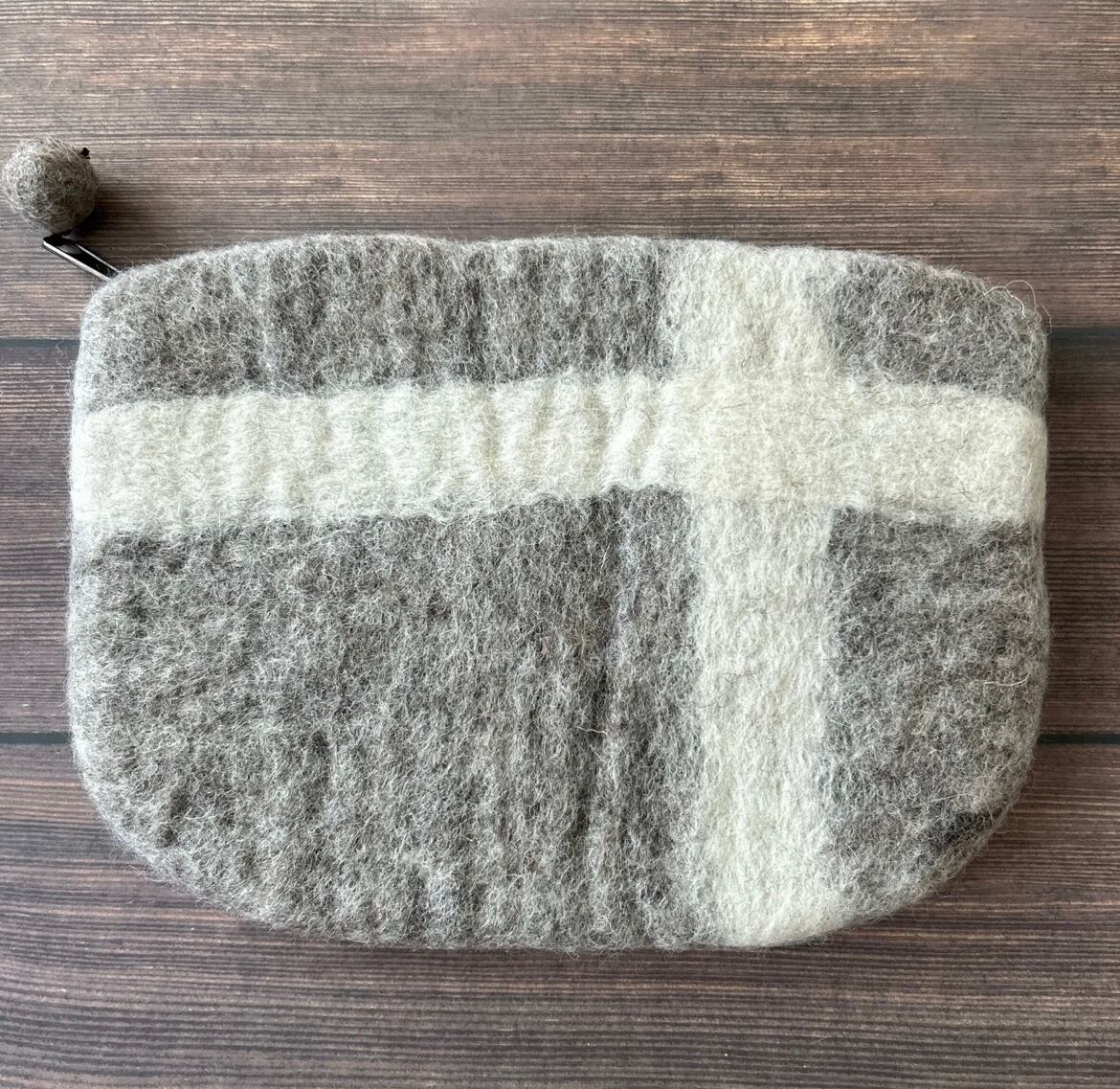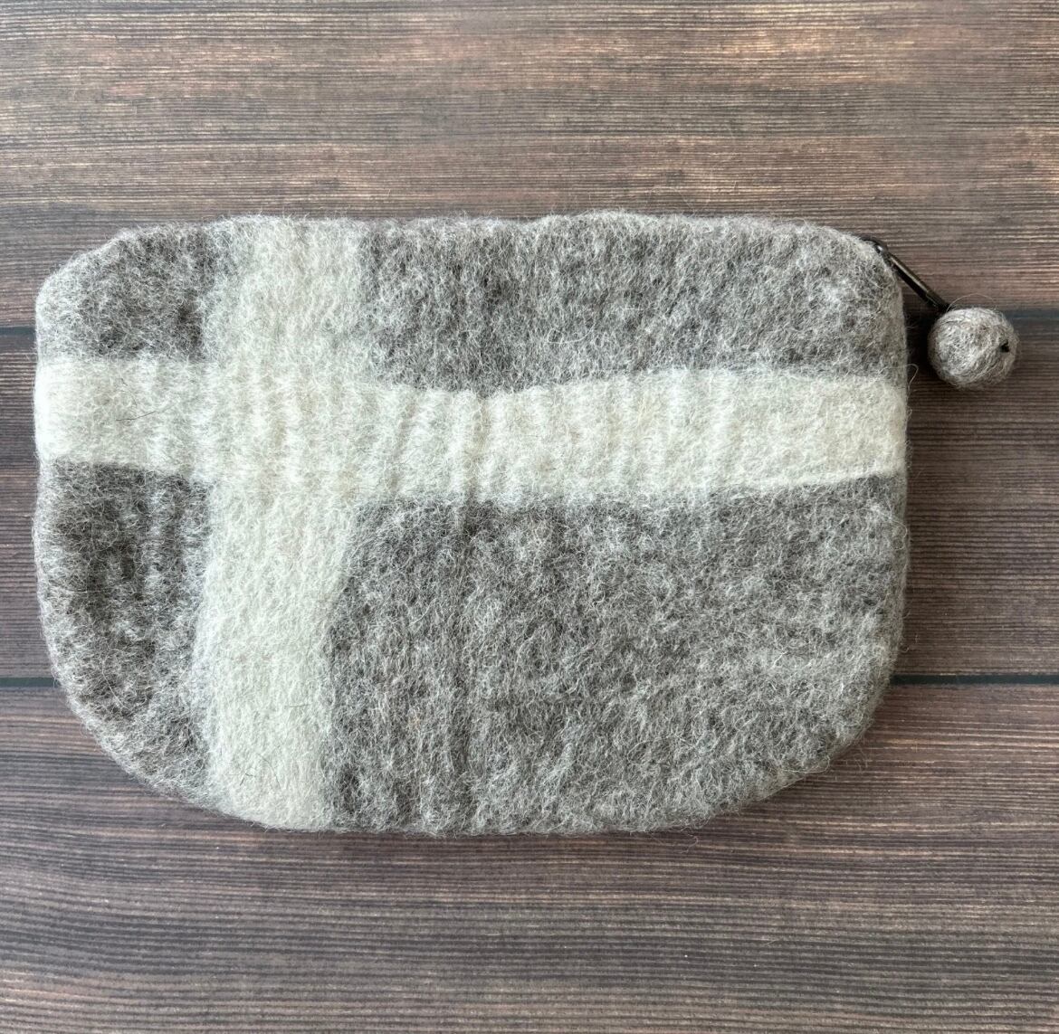 羊毛フエルトのハンドメイドポーチです。 大きなサイズで大容量! 触れた感じでバッグの中でもすぐに取り出せます。 サイズ:約23×16.5㎝